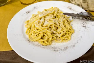 The menu hasn’t changed in these three years. Only the “specials” change, from season to season. I was looking forward to order “caciofi alla giudia” (deep fried artichokes), but artichokes are a Winter vegetable. So we place our bets on “fiori di zucca” (deep fried zucchini flowers - yes, flowers!), “ciufferti fritti” (deep fried baby calamari) and “porcini alla griglia” (grilled mushrooms), to share. As a main I ordered pasta “caccio & peppe” (cheese and pepper) and my friend D ordered carbonara.